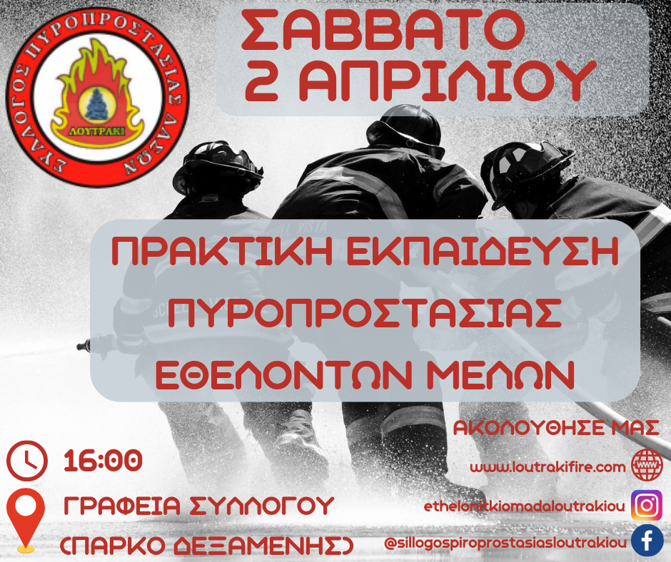 Το Σάββατο 2 Απριλίου στις 16:00, ο Εθελοντικός Σύλλογος Πυροπροστασίας Δασών Λουτρακίου – Περαχώρας πραγαμτοποιεί πρακτική εκπαίδευση στα γραφεία του Συλλόγου στο Πάρκο Δεξαμενής, Λουτράκι και καλεί όλα τα Μέλη να λάβουν μέρος.