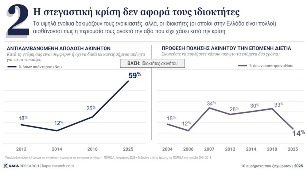 Τα υψηλά ενοίκια δοκιμάζουν τους ενοικιαστές, αλλά οι ιδιοκτήτες (οι οποίοι στην Ελλάδα είναι πολλοί) αισθάνονται πως η περιουσία τους ανακτά την αξία που είχε χάσει κατά την κρίση.