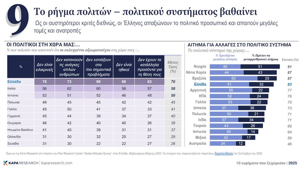 Ως οι αυστηρότεροι κριτές διεθνώς, οι Έλληνες απαξιώνουν το πολιτικό προσωπικό και απαιτούν μεγάλες τομές και ανατροπές.