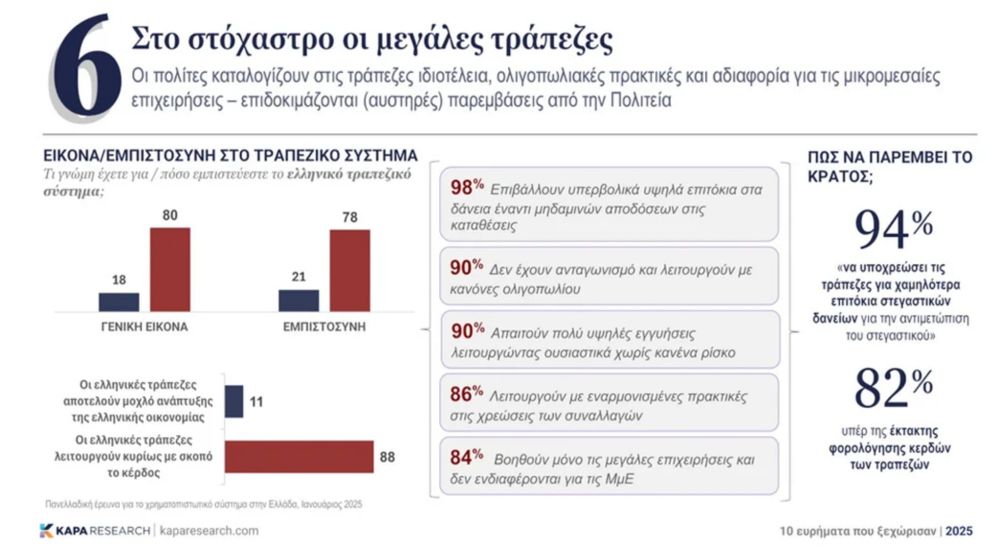 Οι πολίτες καταλογίζουν στις τράπεζες ιδιοτέλεια, ολιγοπωλιακές πρακτικές και αδιαφορία για τις μικρομεσαίες επιχειρήσεις – επιδοκιμάζονται (αυστηρές) παρεμβάσεις από την Πολιτεία.
